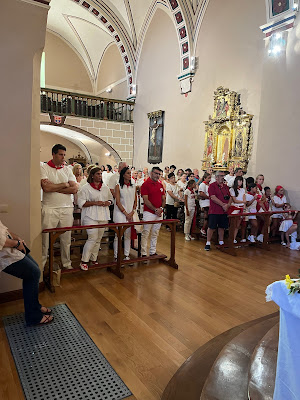 Nuestro párroco Jose Antonio Indurain presidía los cantos dirigidos a nuestros patronos San Miguel y la Virgen de la Asunción mientas el alcalde les colocaba a a ambos el pañuelo rojo.